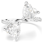 يتألق هذا الخاتم من سواروفسكي بلمسة نهائية باللون الفضي ويأتي بتصميم مُستوحى من فكرة لقاء قلبين. يجسد التصميم روح الرومانسية التي تتجلى في حجري كريستال مقطوعين بدقة فائقة على شكل قلبين يلتقيان في المنتصف. يتألق القلبان بلون أبيض برَّاق يعزز التصميم الأنيق والبسيط جماله الخلاب. يُعد هذا الخاتم من سواروفسكي رمزاً خالداً للحب؛ مما يجعله هدية مثالية لشخص عزيز عليك.